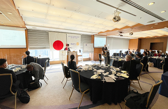 例会出席はロータリー会員の義務の一つです。基本的に週一回開催。昼食をとりながら、会長挨拶や活動報告、来賓やゲストの紹介、職業や趣味の情報交換など親交を深める場として重要です。更に例会の時には30分間のスピーチ(卓話)が行われます。ゲストや会員のスピーチを聞き、ビジネスや社会情勢の最新情報、文化や歴史の話など内容は多岐に渡り、自己啓発や相互理解に役立っています。